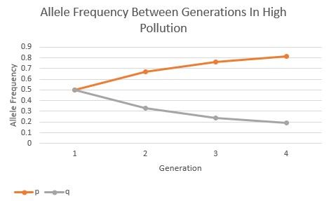 In the high pollution environment, the selection of the dominant allele over the recessive allele occurs at an even faster rate when compared to the moderate pollution environment, as seen below (Fig.4). Between all three of these allele frequency graphs, it’s evident that the rate and intensity of directional selection increases as the pollution increases, showing a clear correlation between the two variables.