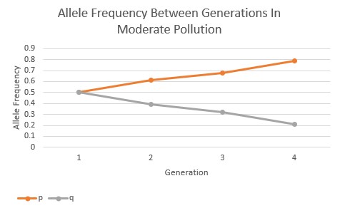 However, as the pollution increased in the environment the allele frequencies began to change in response. In the moderate pollution environment (Fig.3), the recessive allele is passed on to the subsequent generations in lesser and lesser frequency, and the dominant allele increases in frequency over the subsequent generations. The pollution is showing to have a directional selection in favor of the darker-colored, phenotypic expression of the Peppered Moths.