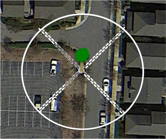 The thermometer was used to record the temperature (°C) of each sampling location, and the percent of impervious surface of the area was calculated using the Pace-to-Plant method. This method was executed by starting at the sampling location, and taking 25 steps at all four 45° angles (Fig.1). Out of all 100 steps taken, we divided the amount of steps that we took on pavement by the total of 100 steps taken to get the percent of impervious surface. After an hour, each index card, containing the food bait and ants, was put into an individual ziplock and brought back to the lab for counting.