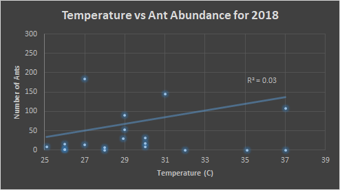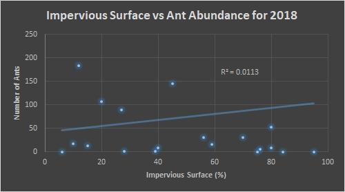 The ant abundance was also at its peak between 30-35°C for the year 2018. In order to better understand the data, a point outside the range of this graph was excluded from view, however the data point is still influencing the trend line. It was for a location where 780 ants were counted in 32°C. The same data point was removed from figure 10, where 780 ants were counted at 77% impervious surface. Here the area with 50-80% impervious surface was where a majority of ants were counted.