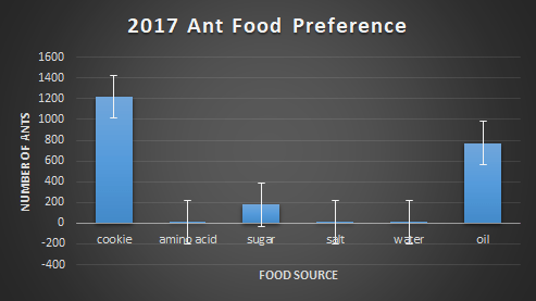 First, each food bait was compared to the amount of ants found on them. Below, figures 2-4 show this relationship. In 2016, the choice of food was overwhelmingly cookie and sugar, and for 2017 and 2018, cookie and oil were the preferred choice of food. The massive difference in ant abundance and food bait choice in 2016 is due to a drought. The lack of water would inevitability drop population numbers and emergence patterns in the ants.