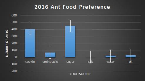 Second, we ran a one-way ANOVA on food preference for each year in order to find if there was a significant preference for certain baits over others. For 2016 the p-value was 0.058, for 2017 it was 0.13, and for 2018 it was 0.051. Due to all p-values being greater than 0.05, we cannot conclude that there’s a significant difference in food preference among baits. On an ecological level, this could imply that ants are very versatile in their consumption needs, making them more adaptable to environmental change.