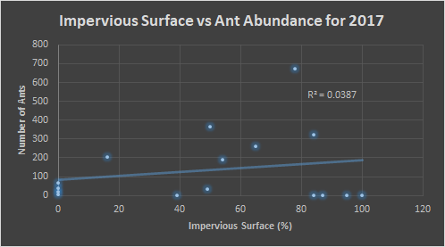Finally, for each year we made two scatter plots, one assessing the affects of temperature on ant abundance and the other assessing the affects of impervious surface percentage on ant abundance. In figures 5 and 6, we see these assessments for 2016. Figure 5 shows a majority of ants being counted in temperatures ranging from 30-35°C, and figure 6 we see that areas ranging in 50-70% impervious surface area had the most ants counted.