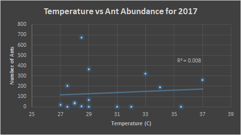 With the data acquired, we compared and analyzed the relationship between the independent variables (impervious surface percentage, temperature, food bait) and the dependent variable (number of ants) for years 2016-2018.