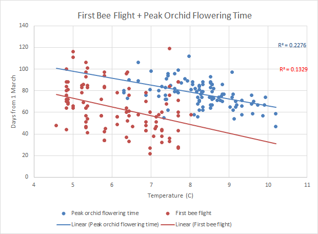 First Bee Flight + Peak Orchid Flowering Time compared to Temperature Credit: Bo Nash