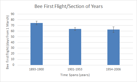 In order to see if there was a correlation between the first flight of the Solitary Bees and the flowering time, scientists and citizen scientist between 1975 and 2009. Researchers also examined specimens of Solitary Bees in the Natural History Museum in London in order to obtain a more comprehensive look at the data. The bar graph below shows the correlation between first flight and time span of years. The bar below also shows that in the last period of years it is shown that bees are having their first flight earlier than at the beginning of the last century.