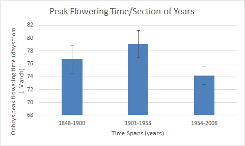 Like most symbiotic relationships between animals and plants, this one in particular involves the Solitary Bee pollinating the Early Spider Orchid. One of the main types of phenology is the flowering of plants and in this instance scientists gathered data from 77 species of the early spider Orchid during the time span of 1848-1958. Using this data along with field observations of Spider Orchids in a single population in the UK between 1975 and 2006, the scientists were able to determine the peak flowering dates for each year. By analyzing this graph you can see how there was been a trend in the fact that the peak flowering time at the end of the century has moved sooner to March 1 by around 3 days compared to the beginning of the century.