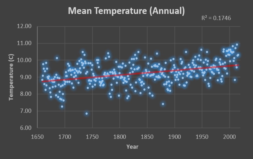 –Long-Term Temperature Trends– The mean temperatures being shown in the graphs below were collected as monthly mean temperatures by the United Kingdom Meteorological Office from 1659-2016 in the cities of London, Bristol, and Preston.
