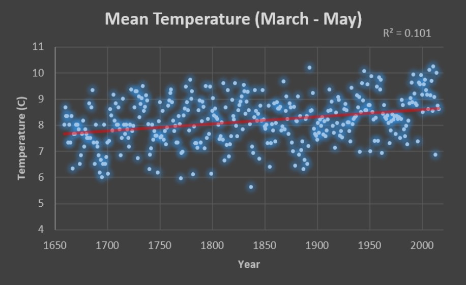 Based on the trend lines for the mean annual temperatures, mean Feb-Apr temperatures, and mean Mar-May temperatures, it appears that the mean temperatures for the last three hundred and seventy years has uniformly increased at a reasonably constant rate. This rate has been roughly one degree every three hundred years. The correlation coefficient (R2) represents how strong the relationship is between two variables. This relationship has a scale range of 0-1. The closer R2 is to 1, the stronger the relationship between the two variables. The graphs above all show their R2 in the top right corners. When comparing R2 between Feb-Apr mean temperatures and the Mar-May mean temperatures, we see that the Mar-May temperatures have the greater R2 value of 0.101. This implies that the data recorded forms a more related connection; hence a more correlated trend line is being shown.